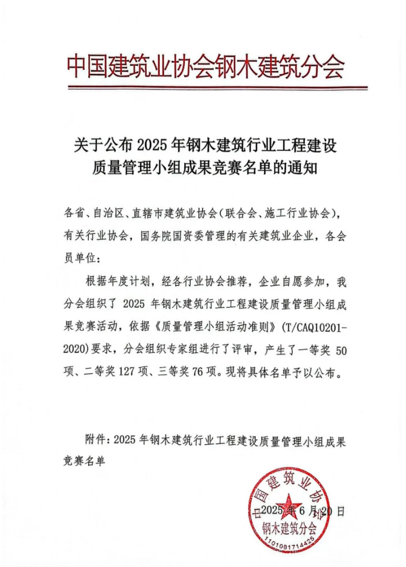近日,在中國建筑業協會鋼木建筑分會主辦的2025年鋼木建筑行業工程建設質量管理小組成果競賽中,中建材鋼構公司憑借卓越的質量管理成果和創新實踐,一舉斬獲多項榮譽,充分彰顯了其在行業內的領先地位和綜合實力。
